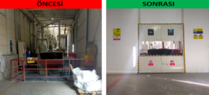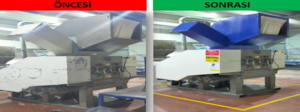 Altyapı ekstrüzyon bölümünde bulunan kırma makinesi, zemin kazılarak makinenin yerden 2 metre derinliğe konulması ve forklift ihtiyacı olmadan malzemenin kırma ünitesine beslenmesi sağlandı. Bekleme israflarını engelleme haricinde daha ergonomik bir alanla personellerin çalışma konforları artırıldı. Makinenin etrafı ses yalıtım panelleriyle kapatılarak da ses seviyesi 105 dB’den 70 dB’e düşürüldü.